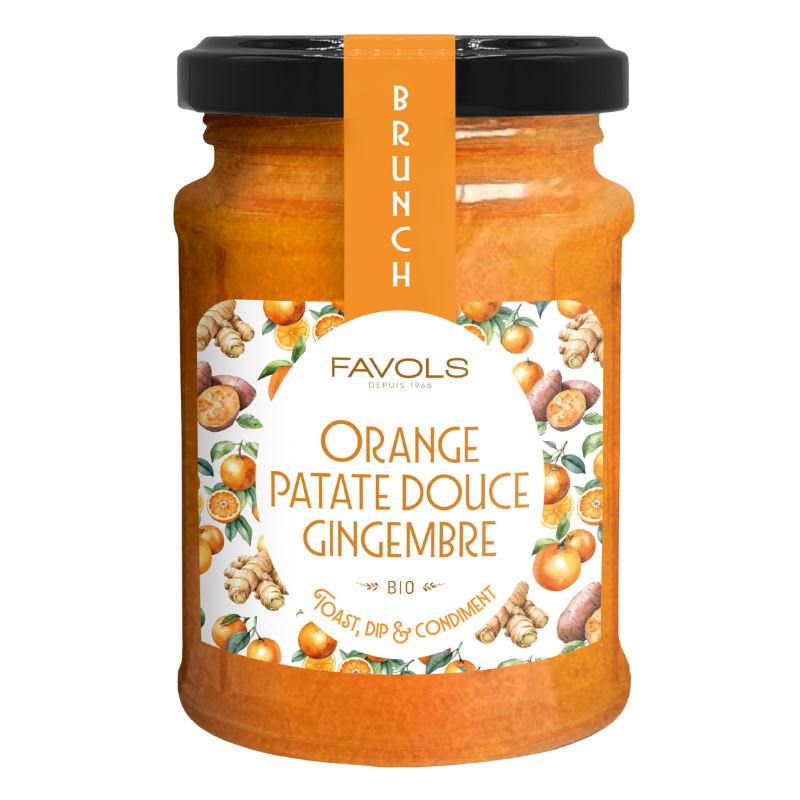 Patate douce*(47%), pulpe orange douce avec écorces*(19%), sucre de canne*, eau, gingembre* (1,3%), jus concentré de citron*.
