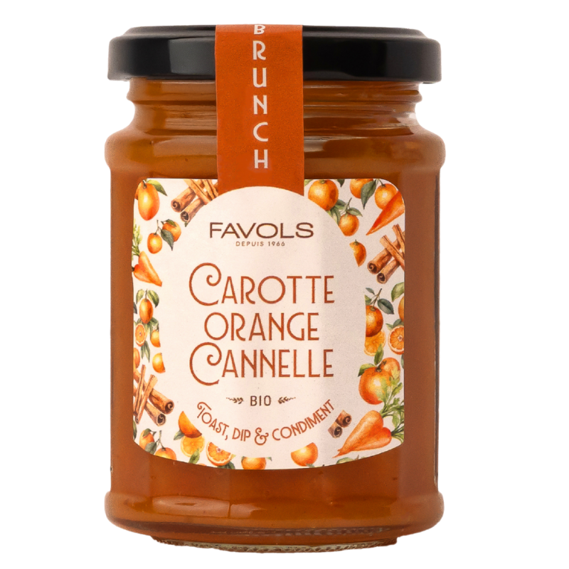 Carotte* (50%), sucre de canne*, pulpe d'orange douce*(16%), eau, jus concentré de citron*, gélifiant : pectine, cannelle*(0,2%).