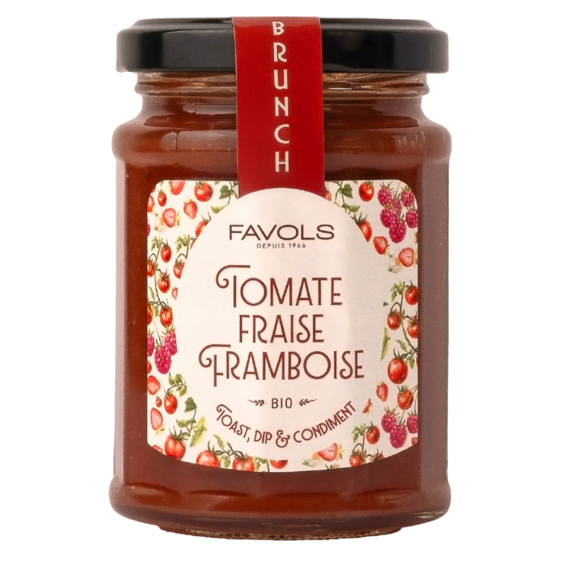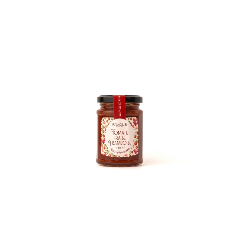 Purée de tomate* (28,5%), fraise* (28,5%), sucre de canne*,eau, framboise* (8%), gélifiant : pectine, jus concentré de citron*.*Produit issu de l'agriculture biologique.